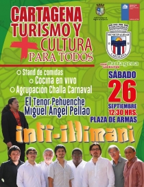 Este sábado 26 de Septiembre, la Comuna de Cartagena celebrará en grande el Día Mundial del Turismo a contar de las 12:30 hrs. en la Plaza de Armas con:Stand de ComidasStand de emprendedores locales...Teatro circenseEn la música el destacado Tenor Pehuenche Miguel Angel Pellaoy el grupo chileno...