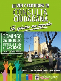 Te invitamos a ser parte de la primera Consulta Ciudadana de la Comuna. Ven y participa este Domingo 26 de julio de 2015 desde las 11:00 hasta las 16:00 horas. Tu opinión nos importa.