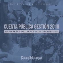La Municipalidad de Casablanca invita a la comunidad de zona urbana y rural a ser parte de la ceremonia de presentación Cuenta Pública gestión 2018 y que responde al principio ético y legal que le compete a todo organismo público en cuanto a informar los resultados de un año de trabajo.