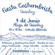 Este Domingo 4 de junio se realizará la II Fiesta Costumbrista del año en la Plaza de Quintay desde las 11:00 a 18:00 horas, como ya es tradición habrá gastronomía típica de la localidad con 20 stand y artesanía de lo más variada con 29 stands. La presencia artística la pondrán los diferentes...