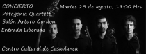 Este martes 25 de Agosto nos visitará el Patagonia Quartett integrado por los chilenos Christian Kausel Kamp (violín), Daygoro Serón (cello), Maximiliano Igor (contrabajo) y el colombiano Alejandro López (guitarra).El concierto será a las 19:00 hrs. en el Salón Gordon del Centro, segundo piso del...