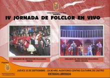 Esta nueva jornada de Folclor en Vivo se enmarca en las celebraciones de las Fiestas Patrias en nuestra comuna, oportunidad en la que se harán presentes dos nuevas agrupaciones locales que se hacen partícipes de este Ciclo que tiene por objetivo proporcionar nuevas instancias para la difusión de las propuestas de distintas agrupaciones de proyección folclórica, tanto de Castro como de alrededores. En esta oportunidad el público podrá disfrutar de las danzas y cantos tradicionales junto al grupo Pegual que interpretará repertorio de la zona central y precederá al Conjunto Senda Chilota, agrupación de larga trayectoria en la interpretación del folclor insular.