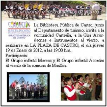 La Biblioteca Pública de Castro, junto al Departamento de Turismo, invita a la comunidad Castreña, a la Gira Acordeones e instrumentos al viento, a realizarse en LA PLAZA DE CASTRO, el día jueves 19 de Enero de 2012, a las 19:00 hrs.