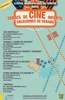 La Biblioteca Pública 235 en conjunto con la Ilustre Municipalidad de Concón, invita a Tarde de Cine Infantil en Vacaciones de Verano. Una variada Cartelera dispone el municipio para entregar cine para los más pequeños que se encuentran en vacaciones, totalmente gratis. Tarde de Cine Infantil...