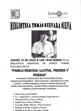 Como ya es una tradición, desde el proceso de modernización, la Biblioteca Municipal de Curicó Tomás Guevara Silva, ha conmemorado el natalicio del poeta Pablo Neruda con nutridos programas culturales y artísticos, con participación de escolares, público en general y numerosos vates locales y de la región del Maule. En esta oportunidad no será diferente y se programa un gran evento artístico-poético-musical, para el próximo jueves 12 de Julio a partir de las 18:00 horas, con un acto solemne que coronará todas las actividades en honor al poeta.