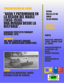 Para finalizar las actividades de la celebración del Día de Patrimonio, realizaremos el lanzamiento del libro "Agua y Patrimonio en la región del Maule (1850-1930). Una Mirada desde la historia", el día martes 07 de Junio en nuestra biblioteca Tomás Guevara Silva a las 19:00 horas.L@s esperamos.