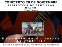 El Concierto se realizará en la Biblioteca de Frutillar, el día viernes 20 de Noviembre, a partir de las 18.15 hrs., En esta ocasión Ensamble presentará parte de su repertorio estudiado el presente año con obras solistas, dúos, tríos, cuartetos y septeto de guitarras de diversos autores de la literatura de este noble instrumento.