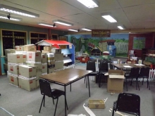 La Biblioteca cerro sus puertas de atención a publico el 22 de Mayo, comenzando asi con los preparativos que resultarian en una biblioteca despejada y lista para recibir los trabajos del proyecto propiamente tal. Asi, se guardo toda la literatura, se embalaron los equipos computacionales, se quitaron los estantes y todo el mobiliario.