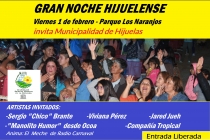 El día viernes 01 de febrero, desde las 20:30 horas, en el Parque Los Naranjos "Gran Noche Hijuelense",Invita Municipalidad de Hijuelas - Todos invitados - Entrada Liberada Se presentarán sólo artistas locales Sergio "Chico" Brante Viviana Pérez Jared Jueh Manolito Humor desde...