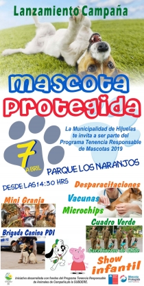 La Municipalidad de Hijuelas le invita a ser parte del Programa Tenencia Responsable de Mascotas. El día domingo 07 de abril desde la 14:00 horas, en el Parque Los Naranjos, se realizará el lanzamiento de la Campaña Mascota Protegida. En la actividad habrá- Mini Granja- Cuadro verde de...