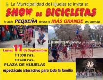 La Municipalidad de Hijuelas invita al Show de Bicicletas desde la más pequeña hasta la más grande del mundo.Lunes 11 de septiembre 201711:00 Hrs. 17:00 Hrs.En la Plaza de HijuelasEspectáculo interactivo para toda la familia.