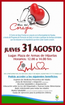 El Centro de Salud Familiar en conjunto con la Municipalidad de Hijuelas, a través del programa de Promoción de Salud, invitan a la comunidad a participar de diversas actividades para cuidar el corazón.Fecha : Jueves 31 de AgostoLugar : Plaza de Armas de...