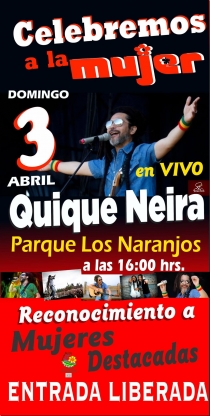 Celebraremos a La Mujer este Domingo 3 de Abril en el Parque Los Naranjos, donde se entregaran reconocimientos a Mujeres Destacadas de la Comuna, tendremos la excelente presentación del Orfeón Municipal y el Gran show de Quique Neira. LOS ESPERAMOS ¡¡¡