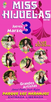 El día jueves 03 de marzo 2016, a las 20:30 horas, en el Parque Los Naranjos, se realizará el Concurso Miss Hijuelas 2016.Esta actividad contará con la música romántica de Jared Pablo Jueh Rojas.Organiza Oficina Comunal de la Mujer - Municipalidad de Hijuelas Entrada Liberada!!!