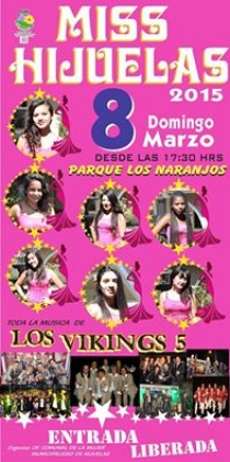 El día domingo 08 de marzo, desde las 17:30 Hrs. se realizará en el Parque Los Naranjos, el Concurso Miss Hijuelas 2015.Con toda la música de Los Vikings 5.Entrada Liberada Invita Municipalidad de Hijuelas