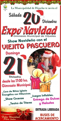 La Municipalidad de Hijuelas invitaEl día sábado 20 de diciembre a la Expo Navidad en el Gimnasio Municipal de Hijuelas, desde las 16.00 horas.El día domingo 21 de diciembre a un Show Navideño también en el Gimnasio Municipal de Hijuelas, desde las 17.00 horas.Se contará con el Coro de Niños de la...