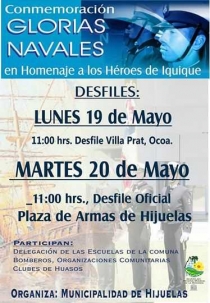 El día martes 20 de Mayo a las 11.00 hrs. se realizará el Desfile Oficial en la Plaza de Armas de Hijuelas.