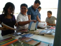 Exposición de libros realizada en el exterior de la biblioteca con libros de folclor chileno, recetas chilenas y literatura chilena, más otros libros varios