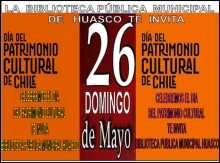 CON UNA GRAN FIESTA LA BIBLIOTECA PUBLICA MUNICIPAL DE HUASCO CELEBRARA ESTE DOMINGO 26 DE MAYO EL DÍA DEL PATRIMONIO CULTURAL CON UNA MUESTRA ARTESANAL, MUSICAL, GASTRONOMÍA, AEREOMODELISMO Y MUCHAS COSAS MÁS DE LA COMUNA Y DE LA PROVINCIA...MÁS DE 50 EXPOSITORES INVITADOS A FORMAR PARTE DE ESTA GRAN MUESTRA CULTURAL...Y ESPECIALMNTE LA MUESTERA DE LIBROS ANTIGUOS Y PATRIMONILAES