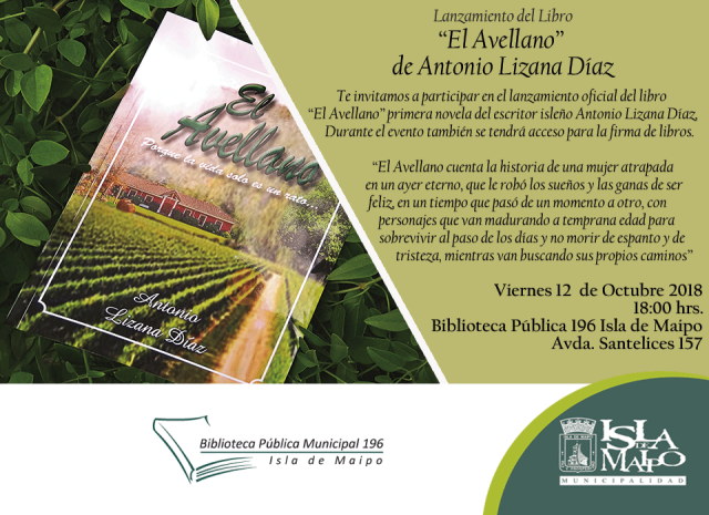 La Biblioteca Pública 196 de Isla de Maipo realizará el lanzamiento oficial del libro “El Avellano” del escritor isleño Antonio Lizana Díaz, el libro es su primera novela publicada y se ha transformado en un verdadero sueño hecho realidad, la historia ha recibido una gran inspiración en la tranquilidad y naturaleza diferente del pueblo de Isla de Maipo, por lo tanto, los lectores disfrutaran de un contexto familiar en las páginas del libro. La presentación del libro estará a cargo de Gastón Silva, miembro de la Editorial Los Primos, además se contará con intervenciones a confirmar.