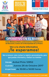 INFORMATIVO: RSH en la Biblioteca de La Pintana 2017La Biblioteca Pública, perteneciente al Departamento de Educación y Cultura de la Municipalidad de La Pintana, Invita a sus vecinos a participar de la Jornada Informativa correspondiente al "Registro Social de Hogares en Tu Biblioteca"Día:...