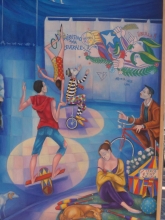 La colorida es autoría de Apolonio Fernández, jóven pintor residente en la localidad de Puente Alto, comuna de Linares. Lo que el desea transmitir a través de su obra denominada "Había una vez un circo.. Homenaje al artista callejero", es  el colorido y variedad del arte citadino, haciendo guiños a lugares de nuestra ciudad.