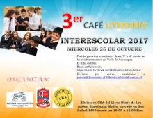 La premiación será el miércoles 25 de octubre 2017 en la 3ª. Versión del Café Literario Interescolar que se realizará en la Biblioteca CRA del Liceo Mixto de Los Andes, Enseñanza Media, ubicado en San Rafael 1453 desde las 10:00 a 12:00 Hrs.