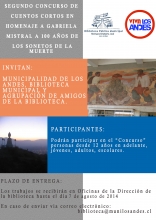 La Ilustre Municipalidad de Los Andes y la Biblioteca Pública Municipal Hermano Emeterio José de Los Andes, en conjunto con la Agrupación de Amigos de la Biblioteca, como aporte a la celebración del Aniversario de fundación de nuestra ciudad, tienen el agrado de convocar a jóvenes y adultos a participar en un concurso de cuentos breves, con el fin de promover y estimular la creación literaria. El tema se centrará en los 100 años de Los sonetos de la muerte, poema creado por Gabriela Mistral durante su estadía en Los Andes.