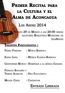 En el marco de la celebración por el 29 aniversario de la Biblioteca Municipal de Los Andes, se realizará el día sábado 29 de Marzo el "PRIMER RECITAL PARA LA CULTURA Y EL ALMA DE ACONCAGUA" contando con importantes músicos del Valle de Aconcagua.