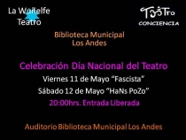 Viernes 11 "Fascista" Compañía Teatro Conciencia.Sábado 12 "HaNs PoZo", La Wuñelfe Teatro.Ambas funciones con entrada liberada, sólo debes retirar tu invitación en Biblioteca Los Andes en horario de oficina a partir del Lunes 7 de mayo. El horario de las funciones es a las 20:00 hrs.