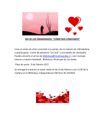 Crea un relato de cómo conociste a tu pareja, de un máximo de 150 palabras y podrás ganar 1 torta de pastelería “La Cota” y una botella de champaña. Puedes enviarlo al correo de biblioteca@munilosandes.cl o por mensaje interno a nuestro facebook : Biblioteca Municipal de Los AndesPlazo de envío : 9...