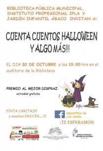 La Biblioteca Pública Hermano Emeterio Jose, Instituto Profesional Ipla y el jardín infantil Ábaco invitan a:CUENTA CUENTOS HALLOWEEN Y ALGO MÁS!!!El Día 30 de Octubre a las 19:00 hrs en el auditorio de la biblioteca.Premio al mejor disfraz. Actividad Gratuita.
