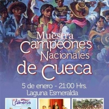 ¡Amigo/as del folklore!, este sábado 05 a las 21:00 hrs. en la laguna esmeralda será la gran "Muestra de Campeones Nacionales de Cueca" con representantes de Arica, Santiago y Rancagua, además de tangueros provenientes de la hermana república Argentina!, no se pierdan este maravilloso espectáculo!