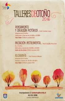 Forma parte de nuestros Talleres de Otoño!Pensamiento y Creación Pictórica, Iniciación Instrumental y Xilografía.Inscripciones a través de contacto@ccmla.cl, envía tus datos (nombre, edad, fono y correo).Mayor información al 43 2312098 / 43 232 5197 CUPOS LIMITADOS