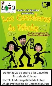 En Colcura, se realizará la OBRA DE TEATRO INFANTIL: "Los Cazadores de Fábulas", DE LA COMPAÑIA DE TEATRO EL ROSTRO, el DOMINGO 22 DE ENERO A LAS 12ºº, EN ESCUELA VALLE COLCURATODOS Y TODAS INVITAD@S