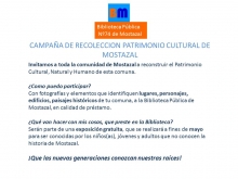 La Biblioteca Pública de Mostazal está en campaña para recuperar el Patrimonio de la comuna. Por tanto te solicitamos compartir tus fotografías antiguas. Todas serán escaneadas y devueltas de inmediato. por favor acercarse a la Biblioteca.