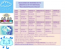 En el marco de las actividades de vacaciones de Invierno, se realizarán las actividades de Cuenta cuento , Peliculas, juegos de salón, como Ludo, Dama, Lotería, etc, Talleres de Arte y pintura en varias especialidades. Dos semanas en entretención. Además de los mejores...