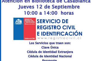 Estimada comunidad: Les informamos que mañanajueves 12 de septiembre a partir de las 10:000 a 14:00 horas, podrán disponer de los servicios del registro Civil en dependencias de nuestra biblioteca.Servicios de los cuales dispondrán son-Clave Única-Cédula de Identidad Extranjera-Cédula de Identidad...