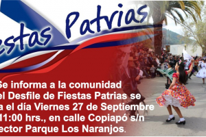 La Municipalidad de Hijuelas informa que el Desfile Oficial Comunal por Fiestas Patrias y en Honor a las Glorias del Ejército, se desarrollará a las 11.00 horas del viernes 27 de septiembre en Av. Copiapó S/N, sector Parque Los Naranjos. La fecha señalada es la que permite contar con...