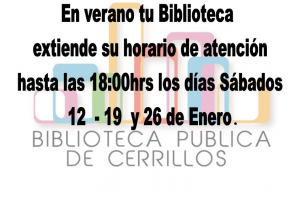 En verano tu Bib1lioteca Javiera Carrera Verdugo extiende su horario por el mes de Enero los dias sábados 12 , 19 y 26 de Enero hasta las 18:00HRS