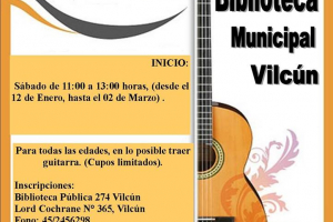 TALLER DE GUITARRA ACUSTICA EN BIBLIOTECA PÚBLICA MUNICIPAL DE VILCÚNLa Municipalidad de Vilcún, en coordinación con Bibliotecas públicas, junto al docente y músico de la comuna, Marco Ponce, invitan al Primer taller de escuela de guitarra acústica en biblioteca 274, orientado a quienes estén...