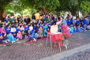 Con la actividad “Cuentacuentos”, la que realizó en la Plaza de nuestra Comuna, los niños y niñas junto a sus profesores y tías disfrutaron de los diferentes cuentos que la tía Carolina Saldivia, les conto en Kamishibai "Teatro de Papel", aporte del Proyecto Vía Ley de Donaciones Culturales.