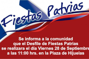 El Desfile de Fiestas Patrias, se realizará el día viernes 28 de Septiembre a las 11:00 horas en la Plaza de Hijuelas.