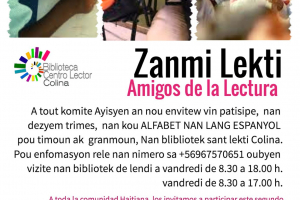 A toda la comunidad Haitiana de Colina, Los invitamos a participar en nuestro taller de alfabetización en español para niños y adultos A tout komite Ayisyen nan Colina an nou envitew vin patisipe nan kou alfabet nan lang espanyol pou timoun ak granmoun en nuestra biblioteca Centro...