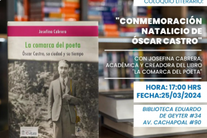 Te invitamos al coloquio "Conmemoración del Natalicio del poeta Óscar Castro" impartido por la académica Josefina Cabrera, autora del libro "La comarca del poeta".La actividad se realizará este lunes 25 de marzo a las 17:00 hrs en la Biblioteca Eduardo de Geyter #34 ubicada en Av....