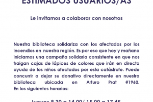 Continua nuestra campaña en ayuda a los niños y niñas afectados por los incendios ocurridos en nuestra región. Esperamos sus donativos en nuestra biblioteca hasta el próximo jueves. Nuestra Biblioteca se encuentra ubicada en Calle Arturo Prat #1960 Edificio dependecias de DIDECO Ilustre...