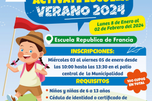 Compartimos para ustedes.Fuente: Fanpage de Facebook Ilustre Municipalidad de Quintero.Entre este miércoles 3 y viernes 5 de enero serán las inscripciones para el Programa Actívate Escuela Verano 2024, que cuenta con 100 cupos para niños y niñas de la comuna. Los esperamos entre las 10:00 y...