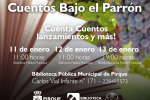 Miércoles 11 Enero 2017 11:00 AM Estadio Municipal de PirquePampanitos de Cuentos, (Sesión de Narraciones para niños) Narradores se reunirán con los niños asistentes al programa de Vacaciones Entretenidas(programa social de la Municipalidad) bajo los arboles para compartir sus...
