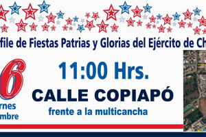 El día viernes 16 de septiembre a las 11:00 horas, en Calle Copiapó frente a la Multicancha, se realizará el Desfile de Fiestas Patrias y Glorias del Ejército.