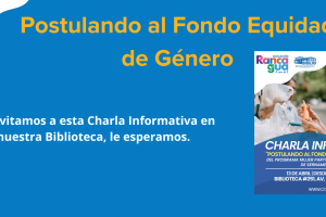 Tenemos una excelente Invitación, este jueves 13 desde las 10:00 tendremos una importante Charla Informativa: "Postulando al Fondo Equidad de Género", que se enmarca dentro del programa Mujer Participación Política y Social del Sernameg O¨Higgins.Esta importante actividad se llevará acabo en...